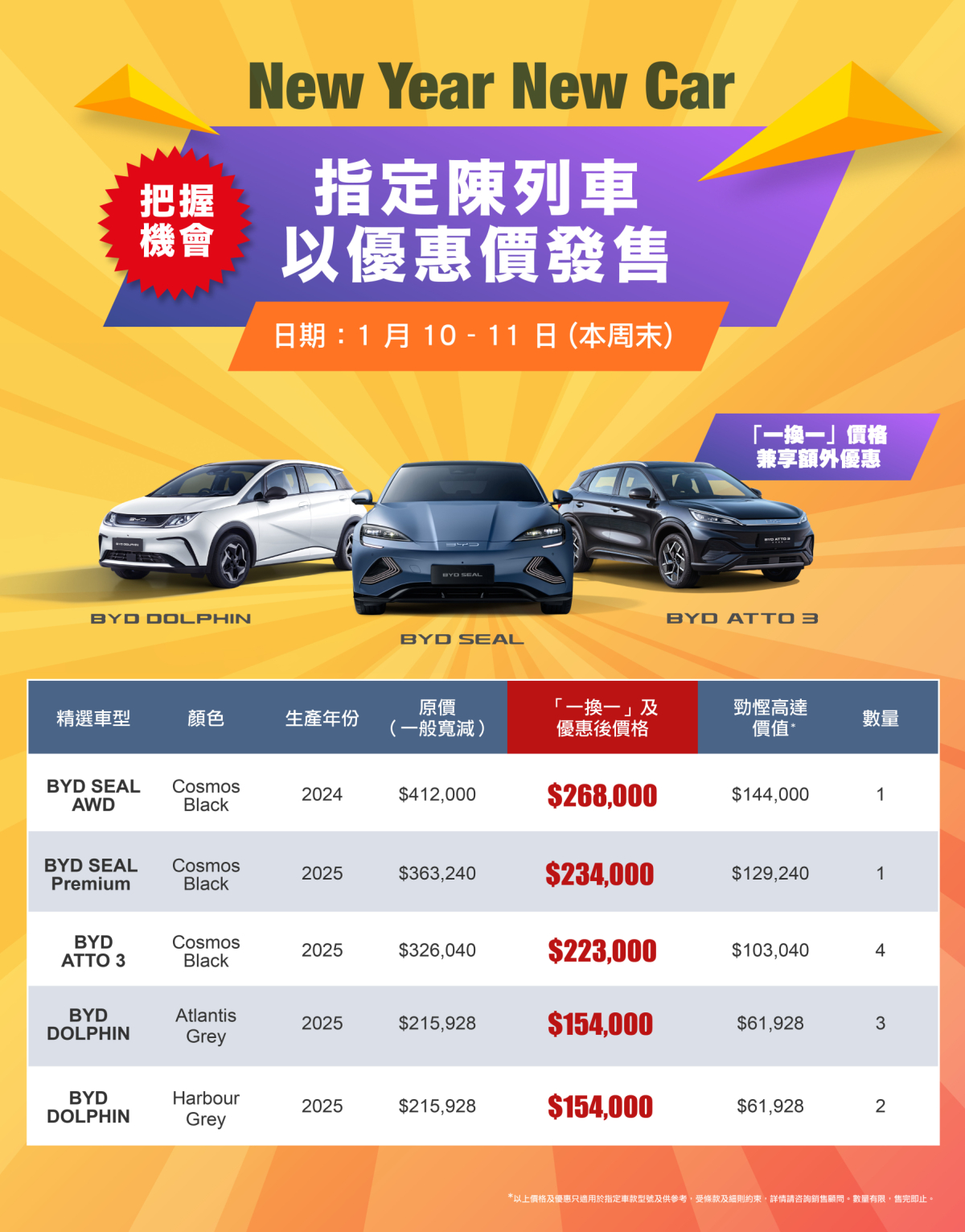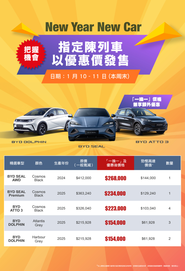 【比亞迪 x 和諧汽車】2025 年1 – 6 月香港全品牌新車登記量 No.1BYD 締造歷史,2025年上半年香港全品牌新車登記量銷量冠軍!感謝每一位香港比亞迪車主的信賴!比亞迪 在 2025 年 1 – 6 月榮獲香港全品牌新車登記量 No.1,持續引領新能源出行新潮流!歡迎親臨感受和諧汽車專業細緻的服務,享受與別不同的獨有購車體驗我們堅守以客為先,務求為大家帶來最優質、最放心的購車體驗!