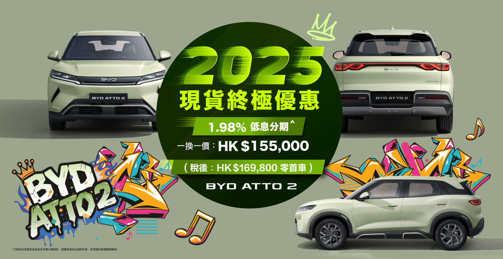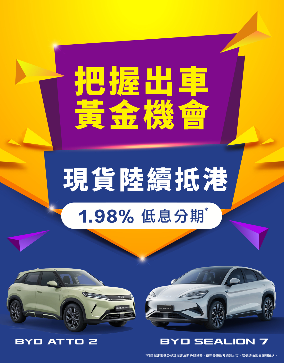 BYD SEALION 7 以出色性能與高性價比,成為不少香港車主的首選電動 SUV。現加推 BYD SEALION 7 (Standard) 意向價 $248,000# 驚喜登場。 BYD SEALION 7 榮獲 EURO NCAP 五星最高安全認證,全程守護您和家人 BYD 獨家超高效刀片電池 + CTB 一體化技術 寬敞車箱空間,盡享私人空間 最新 e 平台3.0,性能與節能完美結合 BYD SEALION 7 全港單一車型銷量 No.1* 無論你是追求科技感、實用性、大空間,還是性價比,BYD SEALION 7 (Standard) 純電SUV 都能滿足你所有需求!立即親臨比亞迪陳列室,親身感受這台冠軍車型的魅力。 立即Click入連結了解詳情:https://bit.ly/2025_0903_BYD_SEALION_7_standard 親臨陳列室:感受 BYD SEALION 7 的魅力 # 以一換一後的售價計算,最終價錢將按PRP而定 *資料來源:香港運輸署 (資料統計時間為:2025年1月1至7月31日) ^優惠受條款及細則約束,詳情請向銷售顧問查詢。