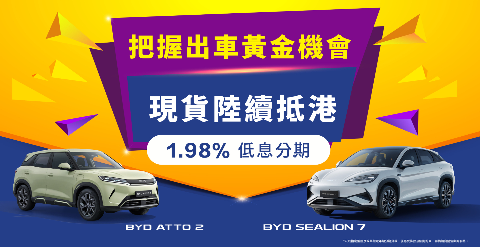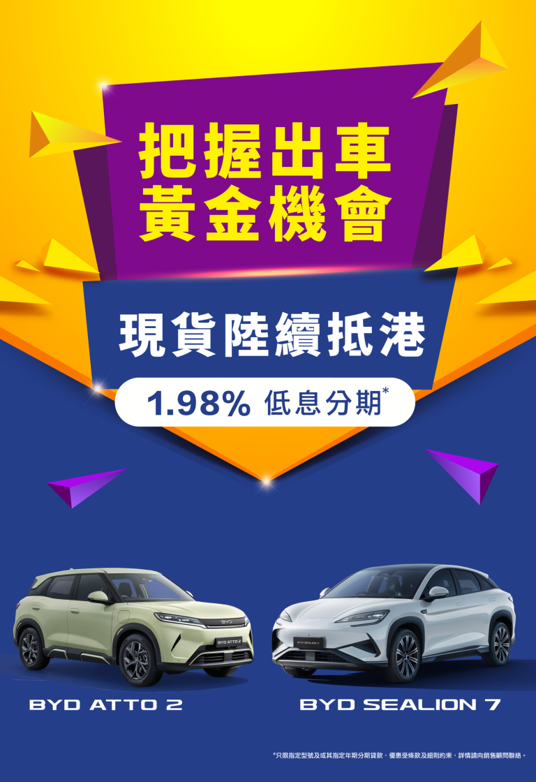 終於等到啦❗備受熱捧的全港銷量 No.1* 車型——BYD SEALION 7 推出限時低息優惠!由即日起至 2025 年 10 月 31 日,以震撼性的 1.98% 低分期利率^,即可擁有,歡迎親身感受「冠軍 從不偶然」的實力。 ✨ BYD SEALION 7 ✨ ✅ 頂尖安全守護:榮獲 EURO NCAP 權威五星安全認證,守護每段旅程。✅ 核心電池科技:配備比亞迪獨家刀片電池與 CTB 電池車身一體化技術,安全與效能兼備。✅ 豪華舒適座艙:內裝 NAPPA 高級真皮座椅,搭配寬敞收納空間,奢華體驗無微不至。✅ 殿堂級音響:12 個頂級丹拿(Dynaudio)揚聲器,打造沉浸式移動音樂廳。✅ 無憂售後保障:尊享電芯終身保修及大灣區聯保服務,讓您暢行無憂。 優惠期有限!機會難得,萬勿錯過!立即行動,體驗冠軍車型的非凡魅力!開啟您的純電駕馭新篇章! 📝 優惠詳情優惠期:即日起至 2025 年 9 月 30 日立即查詢與申請:https://bit.ly/2025_0916_SEALION7_LOAN 我們堅守以客為先,務求為大家帶來最優質、最放心的購車體驗!歡迎親臨感受和諧汽車專業細緻的服務,享受與別不同的獨有購車體驗。 ^只限指定型號及或其指定年期分期貸款,優惠受條款及細則約束,詳情請向銷售顧問聯絡。指定合作金融機構保留審批貸款申請的最終權利和決定。實際最終供款詳情請與我們查詢。受條款及細則約束。 *資料來源:香港運輸署(資料統計時間為:2025 年 1 月 1 至 7 月 31 日) ^優惠受條款及細則約束,詳情請向銷售顧問查詢。